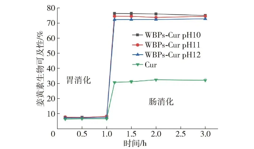 图8 体外消化过程中游离Cur和WBPs-Cur的Cur生物可及性变化