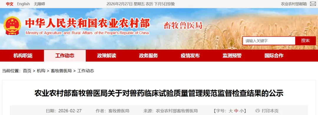 现将监督检查结果予以公示,公示时间自2026年2月27日至3月4日。如对公示内容有异议,请在公示期内向农业农村部畜牧兽医局反映,并提供证明材料。反映人需用真实姓名、单位和联系方式。