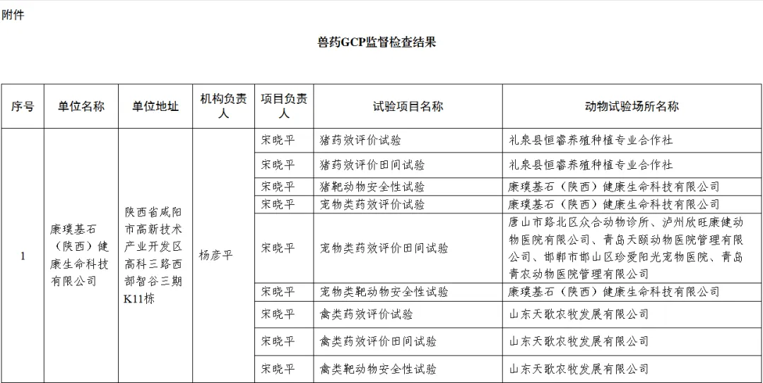 近日,按照《兽药管理条例》、《兽药临床试验质量管理规范》、《兽药非临床研究与临床试验质量管理规范监督检查办法》、《兽药临床试验质量管理规范监督检查标准》以及监督检查相关要求,我局组织中国兽医药品监察所对首次申请成为兽药临床试验机构的康璞基石(陕西)健康生命科技有限公司、河北维渡医药科技有限责任公司、河北象大合众生物科技有限公司符合兽药临床试验质量管理规范(简称兽药GCP)有关情况进行了监督检查。经检查,康璞基石(陕西)健康生命科技有限公司等3个单位的18个试验项目符合兽药GCP要求。