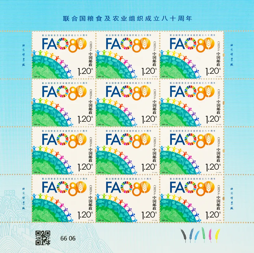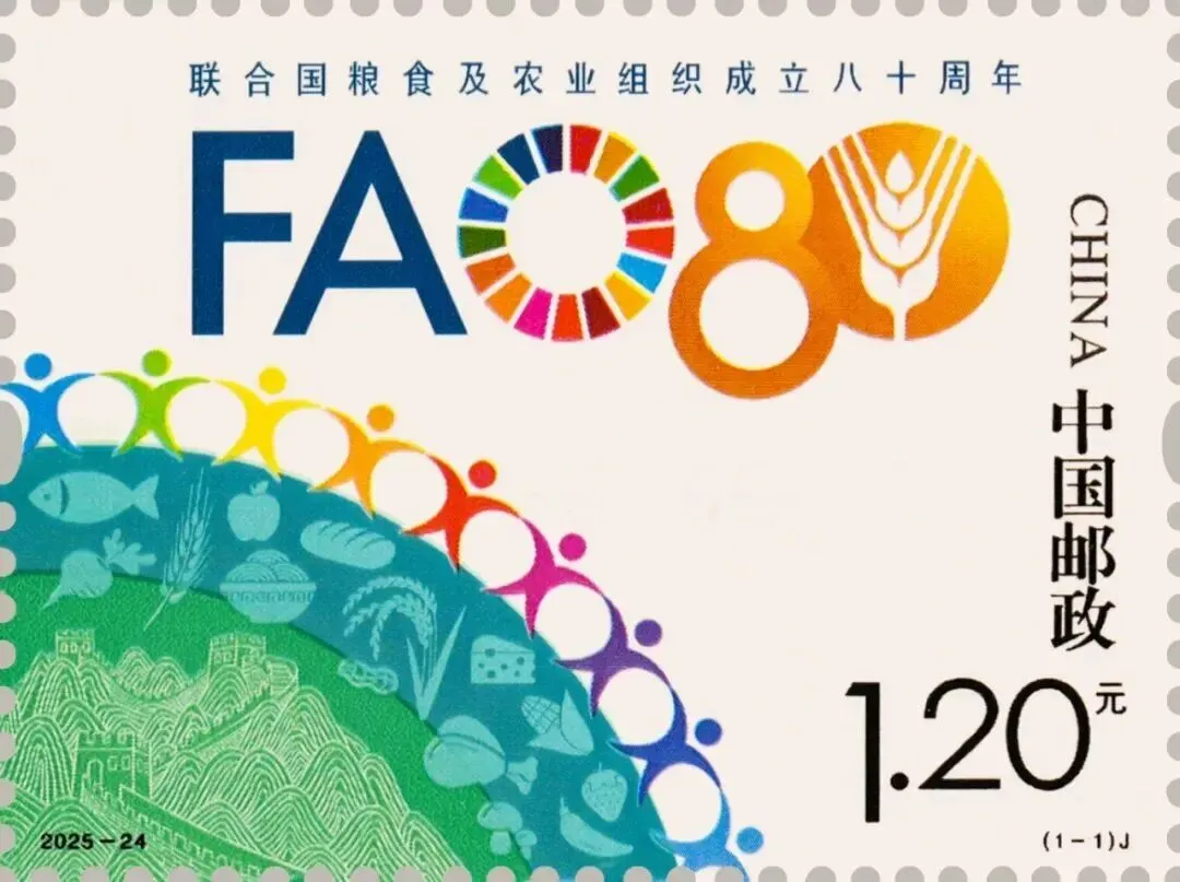 中国邮政于2025年10月16日发行《联合国粮食及农业组织成立八十周年》纪念邮票1套1枚,邮票图案名称为:联合国粮食及农业组织成立八十周年。全套邮票面值1.20元,计划发行数量为460万套。