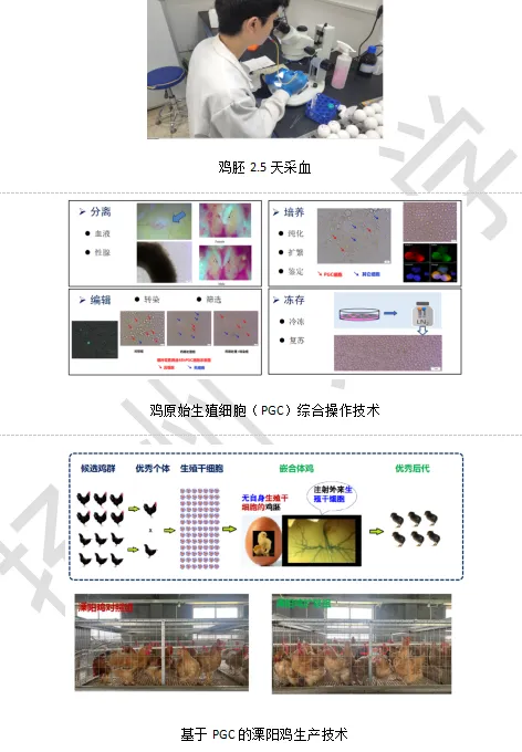 针对上述问题,项目组建立了基于鸡PGC细胞的保种技术平台,从而为地方鸡的保存提供更有效的方法,这将有力保护我国的鸡品种资源,为养鸡业的长远发展提供保障。目前该技术已成功应用于溧阳鸡等品种的细胞保种。该技术不仅可以改进我国地方鸡品种资源的保存工作,而且可促进地方鸡种的利用。可以利用 PGC 快速生产出地方鸡中生产性能优秀个体,显著地提高地方鸡群体的生产性能,提高饲养者的经济效益,从而有力促进地方鸡的推广和高产品系的培育。