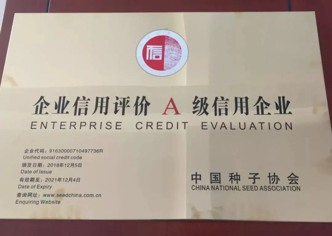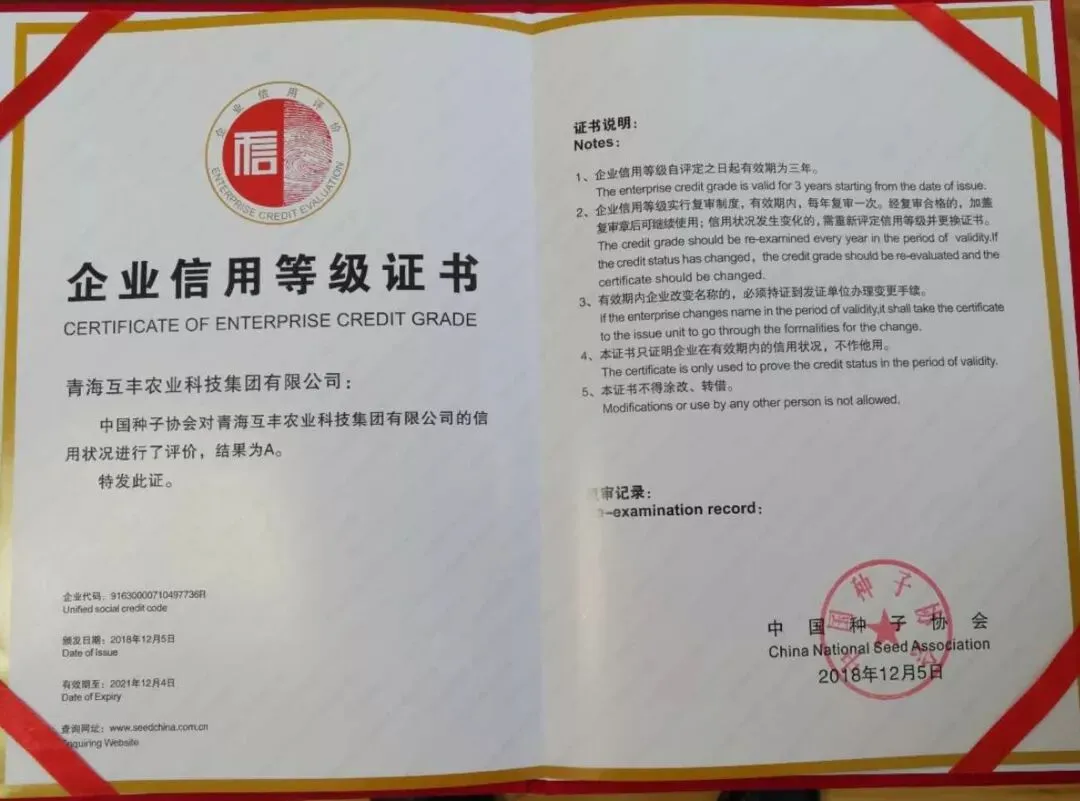 中国种子协会对全国各省区市初审通过的种子企业按照企业基础信息、企业综合素质信息、企业管理能力、企业竞争能力、社会信用记录等五个方面进一步进行了详实的考察评估,青海省互丰农业科技集团有限公司荣获A级信用企业。