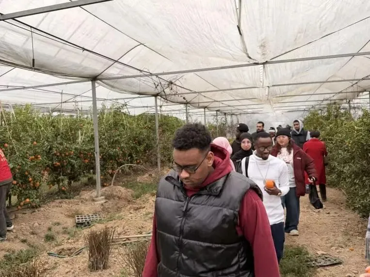 随后,在负责人的带领下,国际学生们前往农场柑橘种植大棚。走进大棚,挂满枝头的柑橘色泽鲜亮、果香四溢,瞬间吸引了大家的目光。在工作人员的指导下,国际学生们亲手采摘柑橘,亲身感受农耕收获的喜悦。采摘结束后,大家现场品尝了新鲜的柑橘,清甜多汁的口感赢得了国际学生们的一致好评。