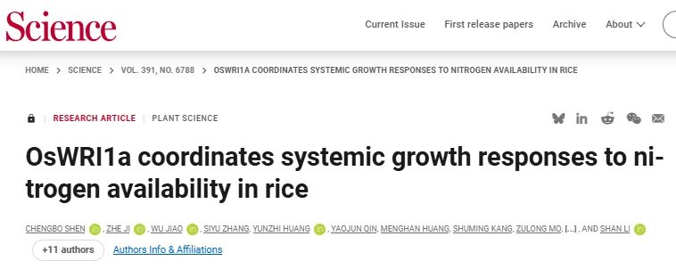 在全球粮食生产体系中,氮肥过量施用已成为生态环境与农业经济可持续发展的关键瓶颈。低氮胁迫下,植物常采取“增根抑冠”策略,虽可提高氮获取,却抑制了作物地上部光合作用与产量形成,在人口持续增长与耕地资源有限的背景下尤为不利。因此,在维持稳定的根-冠生物量比,是农业科学中亟需攻克的重大挑战。南京农业大学李姗教授团队与合作者首次鉴定出调控维持根-冠比稳态的关键基因OsWRI1a,并系统解析水稻根冠协同发育的分子机制。其独特优势在于不改变碳分配模式即可促进根系发育,同时驱动地上部分蘖与光合系统构建,从而在育种中破解“高产-高氮”矛盾,为“减肥增效”型品种选育提供精准靶标。该成果为全球氮肥减施提供可行路径:通过增强根系氮获取与地上部协同发育,可在低氮投入下维持高产;其原理不仅适用于水稻,亦可为其他主粮作物氮高效育种提供借鉴,助力绿色可持续农业发展。