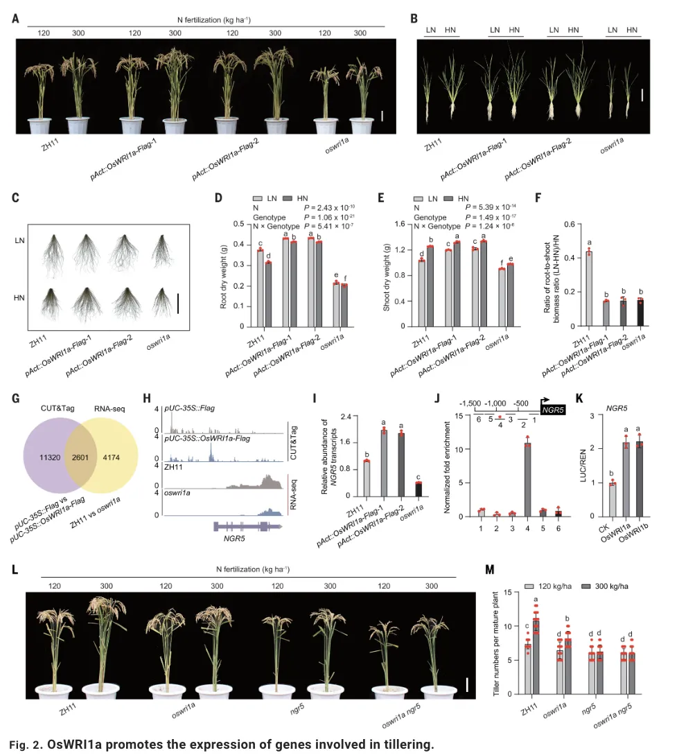 氮素是作物生长发育必需的大量营养元素,但同时也是限制作物产量的主要环境因子。为了追求高产,现代农业大量施用氮肥,不仅增加了生产成本,还导致了土壤酸化、水体富营养化等严重的环境问题。因此,解析作物感知和响应氮素信号的分子机制,培育氮高效利用的水稻品种,是实现农业可持续发展的重要途径。植物在应答不同氮素供应水平时,需要协调地上部(光合作用)与地下部(养分吸收)的生长,即动态调整“根冠比”,以优化资源分配。然而,这一系统性协调生长背后的分子调控网络尚不完全清晰。WRINKLED1 家族基因在拟南芥中被证实参与碳代谢和油脂合成调控,但在水稻中其同源基因 OsWRI1a 是否参与氮素响应及生长协调尚未明确,这为该研究提供了重要探索方向。