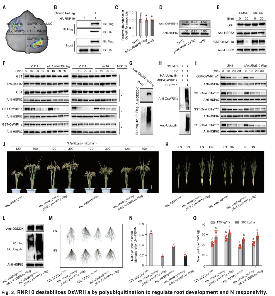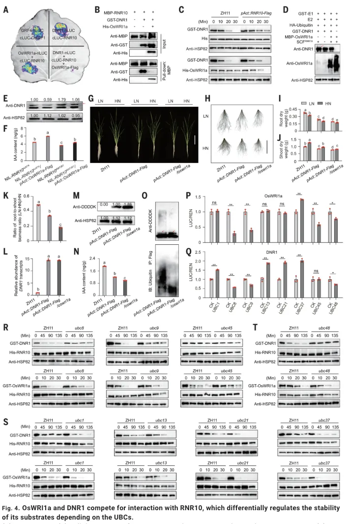OsWRI1a对氮代谢的直接调控解释了氮吸收效率的变化,但这能否完全解释其介导的系统性生长协调?研究者注意到,与野生型相比,oswria单突变体、oswrib单突变体以及oswria oswrib双突变体在低氮条件下的根冠比变化幅度不同,尤其是oswria突变体表现最为明显,提示可能存在一条不依赖于其转录调控活性的信号通路。为了寻找OsWRI1a的互作蛋白,研究人员通过免疫沉淀结合质谱分析,筛选到了一个关键的E3泛素连接酶复合物组分——RNR10,且OsWRI1a与RNR10之间存在直接的相互作用,还意外发现DNR1(一个已知的OsWRI1a下游靶基因产物)也能与RNR10互作,形成复杂的蛋白互作网络。