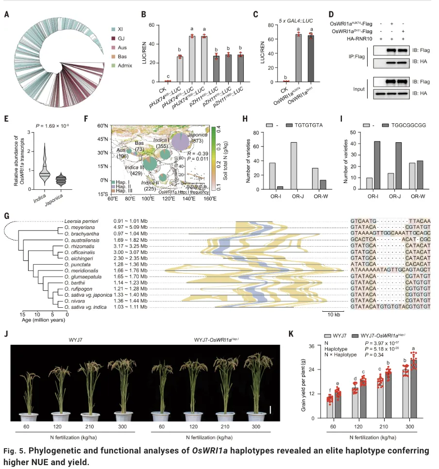 基于上述发现,研究团队构建了一个完整的分子调控模型:在根部,RNR10与OsWRI1a互作,介导其泛素化降解,从而精细调控下游氮吸收基因的表达;同时,RNR10也与DNR1互作,可能参与其他生物学过程。为了探究这一模块的育种应用价值,研究人员利用3,000份水稻重测序数据对OsWRI1a进行了单倍型分析。结果显示,OsWRI1a主要分为两个主要的单倍型(Hap1和Hap2),其中Hap1主要存在于籼稻品种中,而Hap2则多见于粳稻品种。蛋白稳定性分析表明,代表籼稻来源的OsWRI1aHX74蛋白稳定性显著高于粳稻来源的OsWRI1aZH11,这与它们在籼粳稻中的自然变异相一致。
