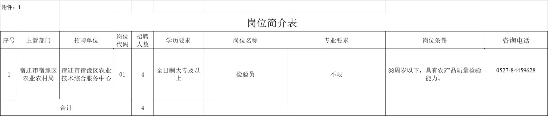 根据工作需要,宿迁市宿豫区农业农村局面向社会公开招聘农产品质量检验员4名(劳务派遣),现将有关事项公告如下: