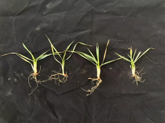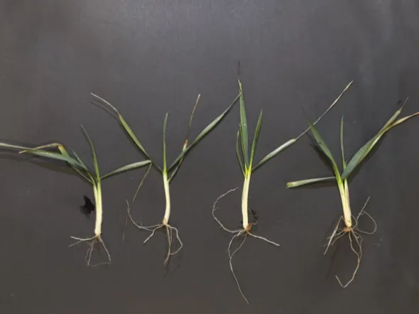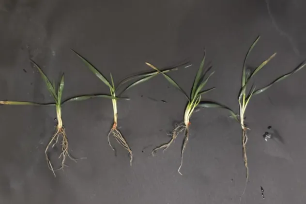 4. 辛集市辛集镇四街村:小麦品种为马兰1号,2025年10月24日,采用15 cm等行距播种,播量为20 kg/亩。冬前进行了镇压,但未进行冬灌。目前小麦个体为3叶到4叶1心,次生根3-4条,1-2个分蘖;群体总茎数70万/亩左右,为二类苗。土壤墒情较好,但部分播种偏浅的小麦分蘖节已处于干土层。播娘蒿等阔叶杂草较多,且有纹枯病发生。