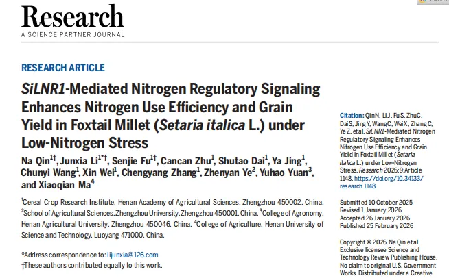 近日,河南省农业科学院粮作所李君霞团队在谷子耐低氮基因挖掘与分子机制研究方面取得重要进展,相关研究成果“SiLNR1-Mediated Nitrogen Regulatory Signaling Enhances Nitrogen Use Efficiency and Grain Yield in Foxtail Millet (Setaria italica L.) under Low-Nitrogen Stress”发表于生命科学领域知名期刊《Research》(中科院1区top期刊,IF=10.9)。该研究通过正向遗传学成功克隆出谷子耐低氮基因SiLNR1,系统阐明了其正向调控谷子氮利用效率和生长发育从而增强谷子耐低氮胁迫的分子机制,为耐低氮作物分子育种提供了新的理论依据和重要的基因资源。