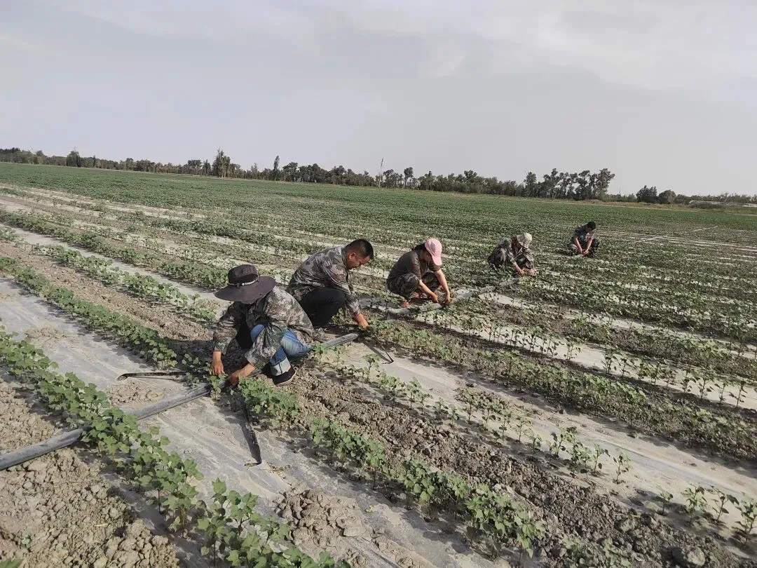 该连“两委”成员主动作为,每天服务于田间地头,指导职工做好水肥运筹、病虫害防治等田间管理,确保田间干净,苗匀、苗壮,促进棉花正常稳健生长。