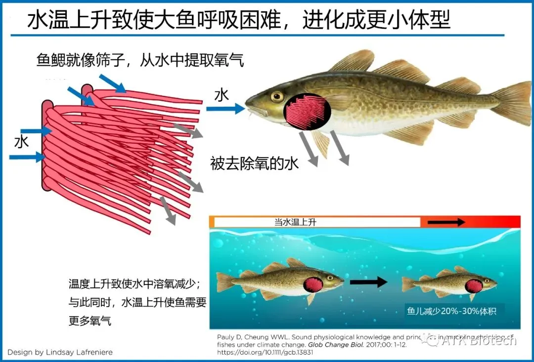 长期以来,科学家一直担心气候变化对鱼类种群的影响,原因之一是某些物种需要在相对固定的温度范围才会繁殖。一个更大问题是,当水温上升时,水中的氧气减少,大鱼受到的影响更大,这是因为相较而言,小鱼比大鱼有更大的鳃面积来获取氧气。