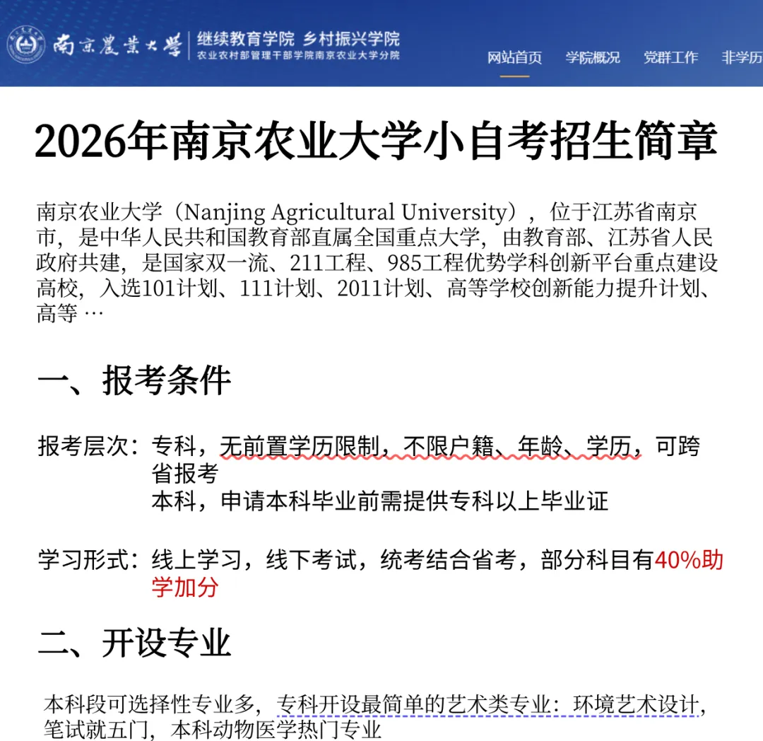 南京农业大学是一所直属教育部领导的全国重点大学,是国家 "211工程"重点建设大学、"985优势学科创新平台"和 "双一流"建设高校。作为江苏省自学考试主考学校之一,南农凭借其雄厚的师资力量和严谨的治学态度,确保了你获得的教育资源优质且过硬。