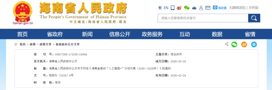 2026年2月24日,海南省人民政府办公厅印发《海南省推动“人工智能+”行动方案(2026—2028年)》