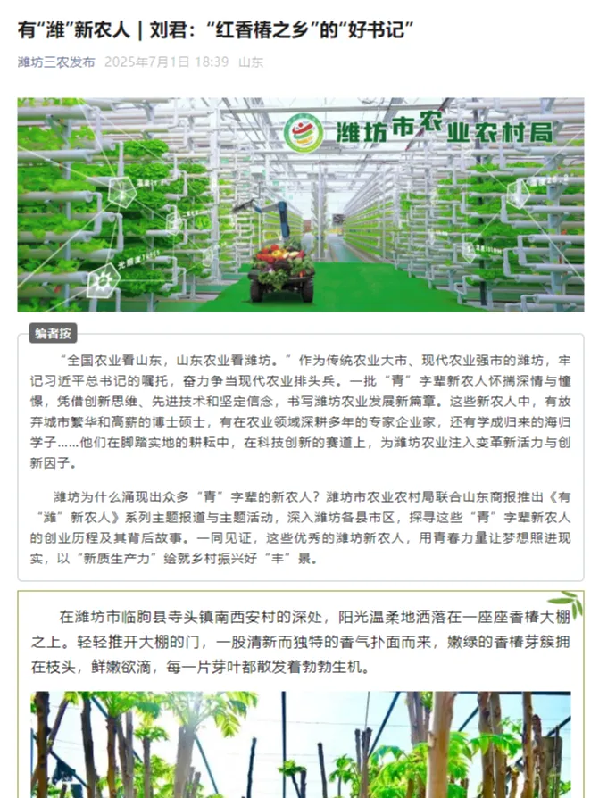 1月22日,“更好潍坊·第二届网络好声音盛典”举办,活动中对全市优秀新媒体账号和优秀作品等进行了表扬。“潍坊三农发布”微信公众号获评“2025年度传播力建设优秀政务新媒体账号”,刘焕珊作品《从农学追梦人到潍坊新农人——以青春之我 扎根三农向未来》获评“‘我和我的潍坊’故事优秀作品”二等奖。