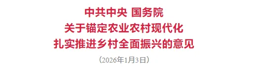农业农村现代化关系中国式现代化全局和成色。“十四五”时期,农业综合生产能力迈上新台阶,脱贫攻坚成果巩固拓展,农民生活水平显著提高,乡村全面振兴取得明显进展。“十五五”时期是基本实现社会主义现代化夯实基础、全面发力的关键时期,要加快补上农业农村领域突出短板,加快建设农业强国。2026年是“十五五”开局之年,做好“三农”工作至关重要。要坚持以习近平新时代中国特色社会主义思想为指导,深入贯彻党的二十大和二十届历次全会精神,认真落实四中全会部署,全面贯彻习近平总书记关于“三农”工作的重要论述和重要指示精神,坚持把解决好“三农”问题作为全党工作重中之重,坚持和加强党对“三农”工作的全面领导,完整准确全面贯彻新发展理念,坚持稳中求进工作总基调,坚持农业农村优先发展,坚持城乡融合发展,锚定农业农村现代化,以推进乡村全面振兴为总抓手,以学习运用“千万工程”经验为引领,以改革创新为根本动力,提高强农惠农富农政策效能,守牢国家粮食安全底线,持续巩固拓展脱贫攻坚成果,提升乡村产业发展水平、乡村建设水平、乡村治理水平,努力把农业建成现代化大产业、使农村基本具备现代生活条件、让农民生活更加富裕美好,为推进中国式现代化提供基础支撑。
