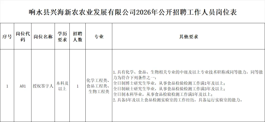 5.具备报考岗位要求的其他资格条件,详见《响水县兴海新农农业发展有限公司2026年公开招聘工作人员岗位表》(工作年限计算时间截止2026年3月1日)。