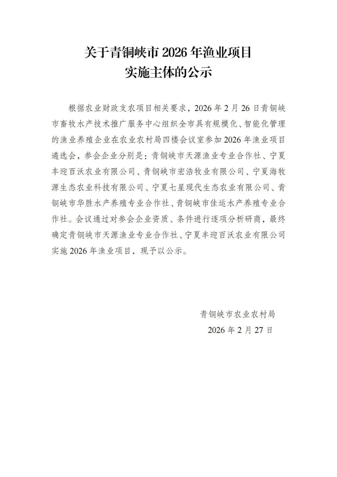 >关注丨关于青铜峡市2026年渔业项目实施主体的公示