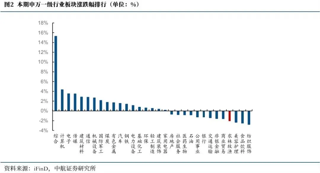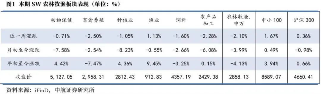 本期(2026.2.07-2026.2.21)上证综指收于4082.07,本期涨0.41%;沪深300指数收于4660.41,本期涨0.36%;本期申万农林牧渔行业指数收于2858.13,本期跌2.10%,在申万31个一级行业板块中涨跌幅排名28位,二级板块动物保健、畜禽养殖、种植业、渔业、饲料、农产品加工的周涨跌幅分别为-0.71%、-2.50%、-1.05%、1.13%、-1.60%、-2.28%。