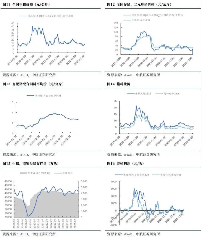 猪价仍将面临一定压力,产能去化趋势或不改。据Mysteel,生猪养殖样本企业数据,国内能繁母猪存栏量自24年以来趋势增加,25年8月才起止涨转降。考虑前期产能水平和养殖效率提升,26年前期行业生猪供给水平或仍较高,尤其是进入淡季后,猪价将面临压力。按照三方Mysteel样本数据,国内能繁母猪存栏量截至11月末累计回落约1.4%。从历史生猪周期产能去化幅度看,当前行业产能去化幅度较低,随着未来猪价行情压力,行业产能去化趋势或不改。