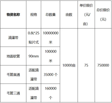 备注:亩数为预估数量,以实际发生为准,成交供应商需附赠足量卡箍。供应商单价报价,总价报价均不得超过最高限价。