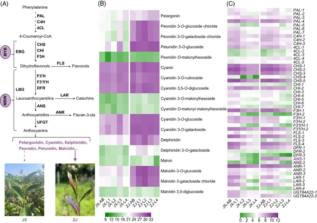 近日,中国农业科学院茶叶研究所茶树种质资源创新团队在The Plant Journal上在线发表了题为“Cis-regulatory evolution of CsANS1 drives cultivar variation in anthocyanin accumulation in tea plants”的研究论文。该研究发现,花色素合成酶(CsANS1)是决定茶树品种间花青素积累差异的关键遗传决定因子。以高花青素品种‘紫娟’(ZJ)和低花青素品种‘金萱’(JX)的F1代杂交群体为研究材料,整合代谢组学、转录组学、群体遗传学和分子生物学等手段进行了系统研究。
