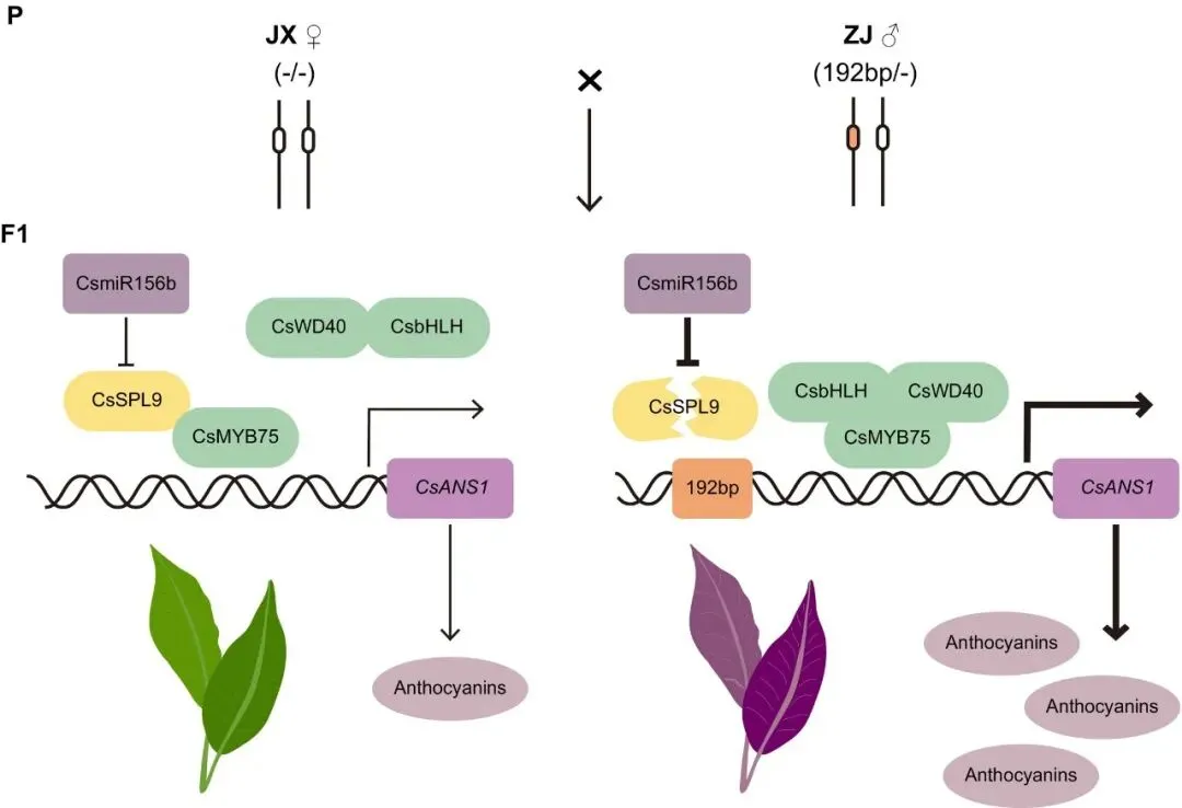 通过对F1杂交群体的代谢组和转录组联合分析发现,CsANS1的表达量与花青素含量呈极显著正相关,是驱动该杂交群体花青素变异的核心基因。虽然CsANS1编码区存在两个非同义突变,但在拟南芥中的异源过表达实验表明,不同等位基因的功能无显著差异。关键在于CsANS1启动子区:在高花青素品种的CsANS1启动子中,均保守存在一个192 bp的插入片段,而在低花青素品种中该片段完全缺失,且该插入片段与杂交群体的高花青素表型完全连锁。含有此192 bp插入的启动子活性显著提升,且该片段的存在显著增强了转录因子CsMYB75对CsANS1的转录激活能力。