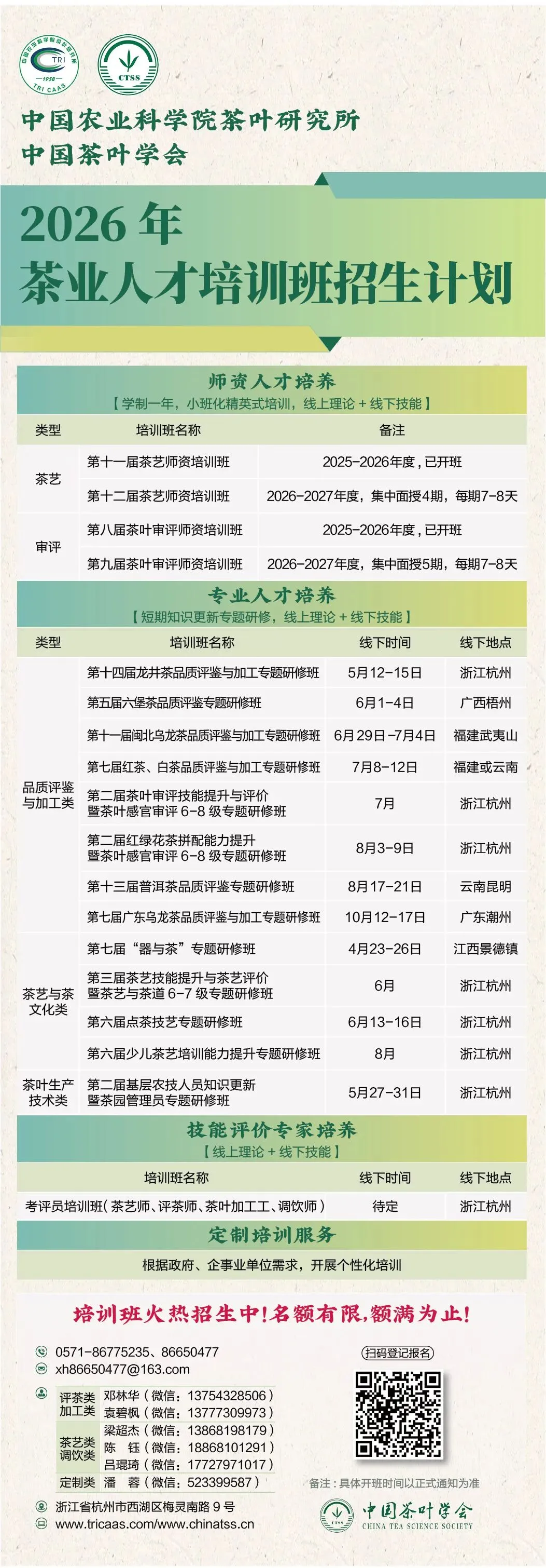 中国农业科学院茶叶研究所硕士研究生刘奕茗和徐晓莹共为论文的第一作者,陈亮研究员、赵学成助理研究员和金基强研究员为通讯作者。研究得到了浙江省农业新品种选育重大科技专项、中国农业科学院科技创新工程、中国农业科学院茶叶研究所重点研究任务以及江西省人才计划的资助。
