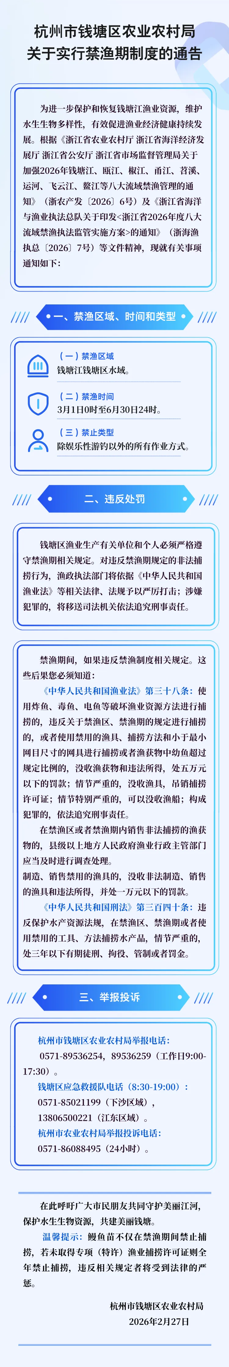 >杭州市钱塘区农业农村局关于实行禁渔期制度的通告