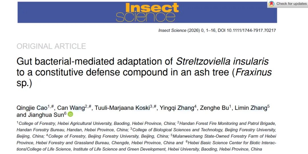 图 4. Cao等(2023a)从小线角木蠹蛾中分离并于本实验幼虫体内再次发现的肠道细菌分离株及其对 6000 ng/µL 浓度羟基酪醇的降解能力 。不同字母表示具有统计学显著差异(P ≤ 0.05,Duncan 氏检验,F = 3930.599,df = 5,P < 0.01)。