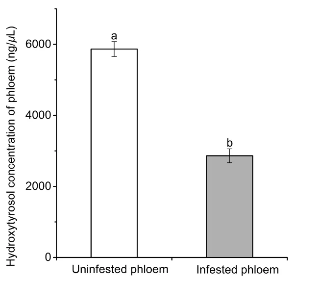 图 1未受侵染与小线角木蠹蛾侵染的大叶白蜡韧皮部中羟基酪醇浓度的显著差异。图中不同字母表示基于 t 检验分析的统计学显著差异(P < 0.05)。