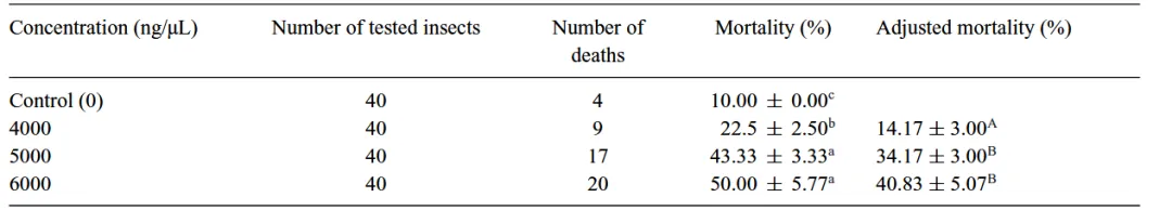 注:小写字母表示死亡率的差异,大写字母表示基于ANOVA和Levene ' s检验的处理间校正死亡率( P < 0.05)的差异。校正死亡率是基于羟基酪醇浓度为4000 ng/µL 和5000 ng/µL 与6000 ng/µL ( F = 13.206, df = 2 , P < 0.006)之间的ANOVA比较。