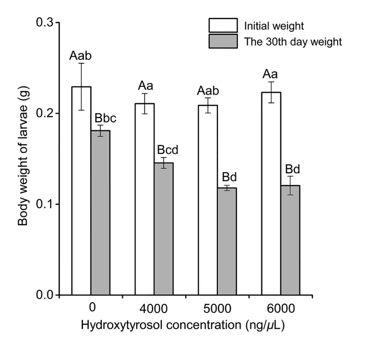图 2. 取食添加不同浓度(0、4000、5000 和 6000 ng/µL)羟基酪醇的人工饲料后小线角木蠹蛾的体重变化。体重差异采用单因素方差分析(ANOVA)及 Duncan 氏法进行事后两两比较。大写字母表示相同浓度下不同时间的体重差异,小写字母表示不同浓度组间的体重差异(P < 0.05)。