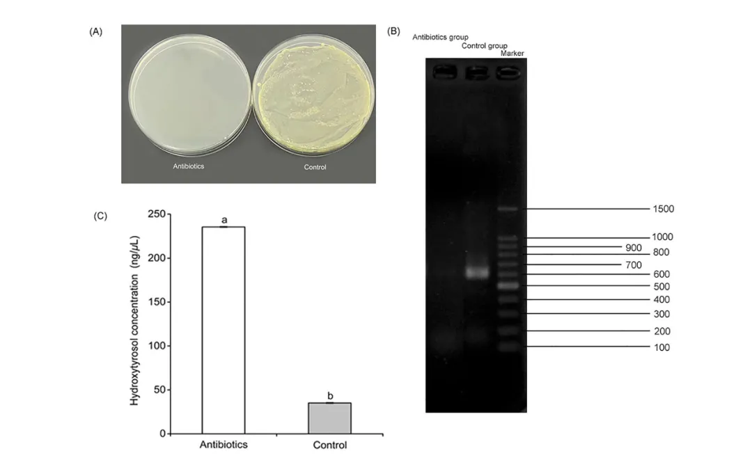 图 3. 小线角木蠹蛾肠道细菌参与羟基酪醇降解的体内实验结果。(A) 暴露于抗生素组与对照组(无抗生素)在 LB 培养基中的肠道微生物菌落形成单位(CFU)。(B) 抗生素处理组(左)与对照组(中)肠道微生物多样性的鉴定 。最右侧为 1.5 kb DNA 分子量标准品组。(C) 分别测定暴露与未暴露于抗生素的小线角木蠹蛾幼虫粪便中的羟基酪醇浓度。不同字母表示基于 t 检验分析的统计学显著差异(P < 0.05)。