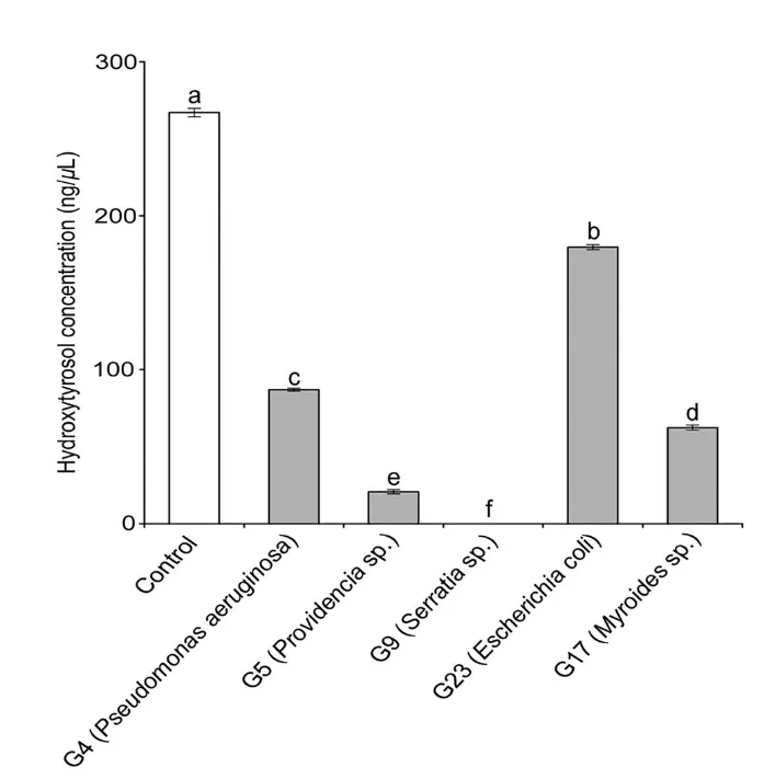 体外分离与鉴定:从肠道中分离出的5株优势菌(铜绿假单胞菌、普罗威登斯菌、沙雷氏菌、米罗氏菌、大肠杆菌)均展现出降解能力。其中,沙雷氏菌(Serratia sp. G9)的降解效率最高,在24小时内可降解 100% 的羟基酪醇。