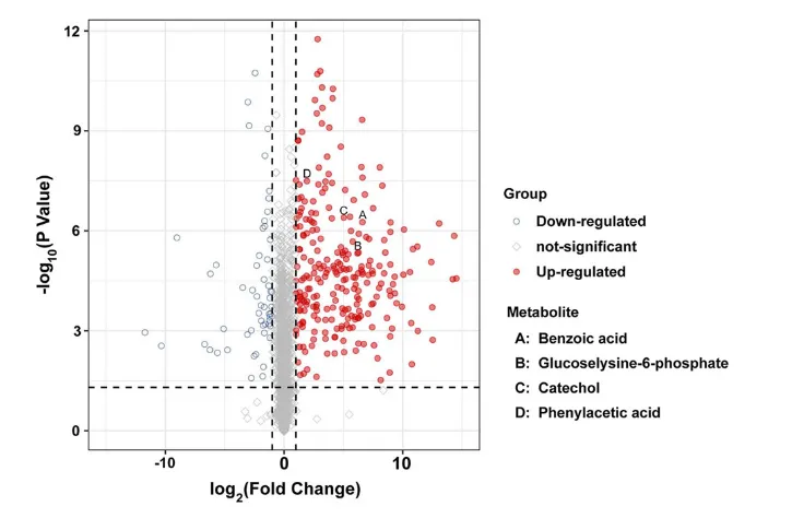 图 5. 对照组(不含羟基酪醇的细菌)与处理组(含羟基酪醇的沙雷氏菌 Serratia sp. G9 菌株)之间差异表达代谢物的火山图。上调代谢物以红色实心圆点表示,下调代谢物以蓝色空心圆点表示;非显著差异代谢物以灰色菱形表示(P < 0.05,fold-change > 1 或 < -1)。