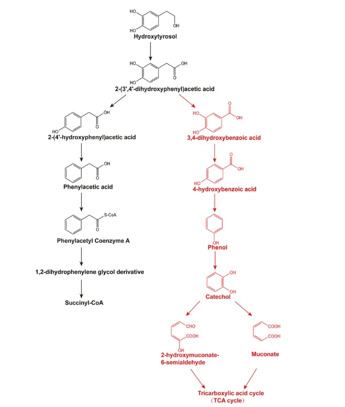 核心途径:研究提出了两条降解路径。其中红色路径展示了羟基酪醇转化为 4-羟基苯甲酸、苯酚、儿茶酚等中间产物,最终进入 三羧酸循环(TCA) 产生 ATP 的过程 。这一发现暗示了肠道微生物不仅能解除毒素,还能变废为宝,将防御物质转化为能量 。