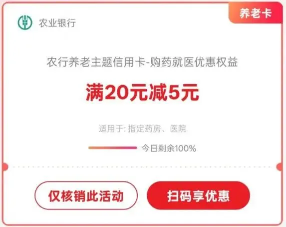 活动内容活动期间,持卡人在指定药房和医院使用云闪付APP、农行掌银APP二维码支付,绑定农行养老主题卡有机会享单笔满20元立减5元,每月每卡限享1次。活动名额每日866个。