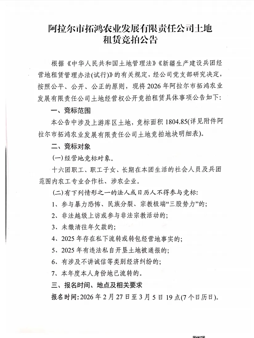 >阿拉尔市拓鸿农业发展有限责任公司土地租赁公示