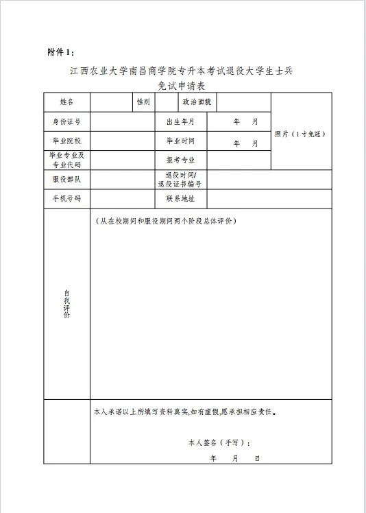 附件1:江西农业大学南昌商学院专升本考试退役大学生士兵免试报名表.docx.docx
