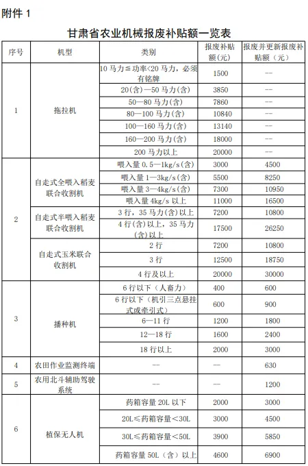 附件:甘肃省农业机械报废补贴额一览表
