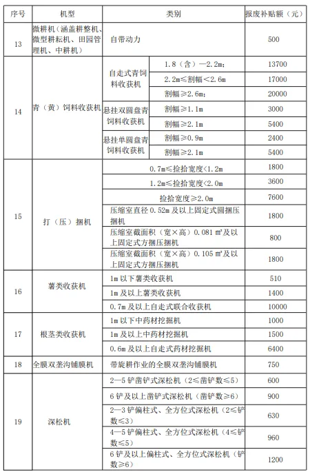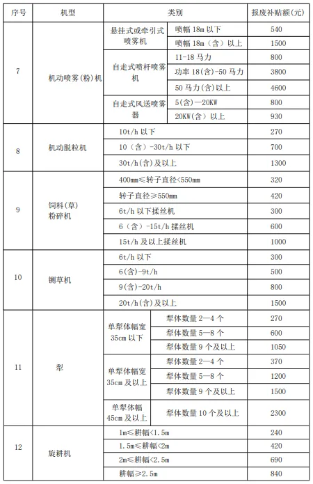 当前入围全省报废补贴范围为拖拉机、播种机、联合收割机(包含稻麦联合收割机、玉米联合收获机)、田间作业监测终端、农用北斗辅助驾驶系统、植保无人机、机动喷雾(粉)机、机动脱粒机、饲料(草)粉碎机、铡草机、粮食干燥机(烘干机)、色选机、磨粉机、犁、旋耕机、微耕机、青(黄)饲料收获机、打(压)捆机、薯类收获机、根茎类收获机、全膜双垄沟铺膜机、深松机、联合整地机、果蔬烘干机、粮食清选机等25个机具种类纳入报废补贴范围。