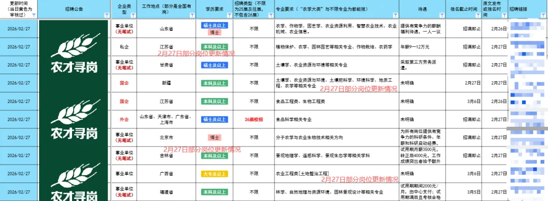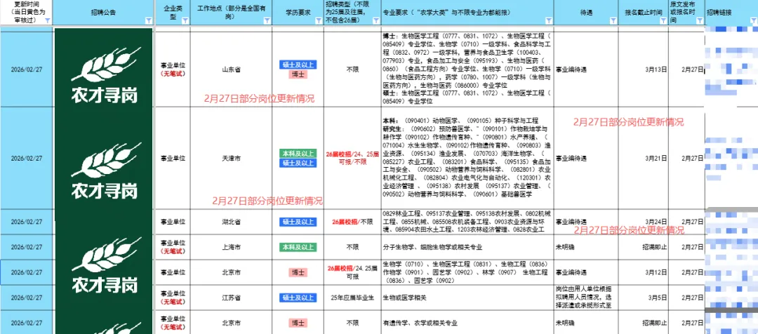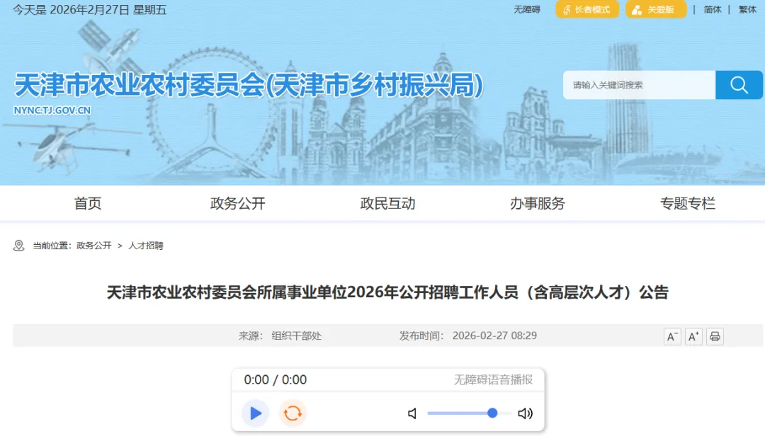 招聘公告在天津市人才服务中心网、北方人才网、天津市农业农村委员会网站上发布。报考人员于2026年2月27日开始,通过下列网站查询: