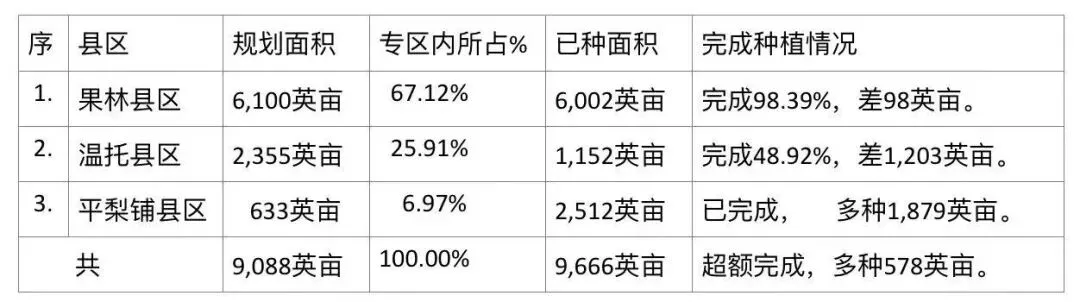专区内三个县区:果林县区、温托(Wuntho)县区及平梨铺(Pinlebu)县区各县区规划种植的冬花生面积及目前完成的种植面积如下表: