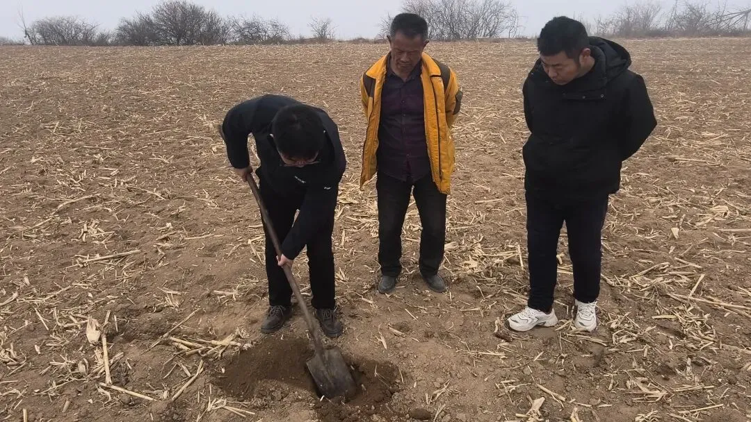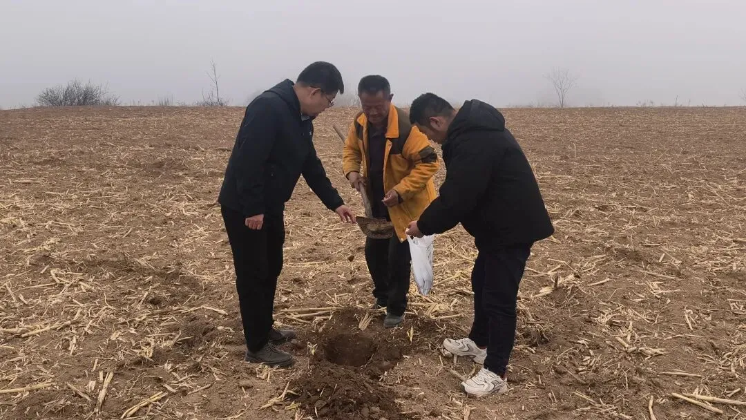 薄雾笼罩的田埂上,技术人员与工作人员一同深入闫锁奇的耕地,按照科学规范的流程,使用铁锹等工具采集土壤样本。从点位选择到分层取样,每一个环节都细致严谨,确保样本能够真实反映土壤的肥力状况。