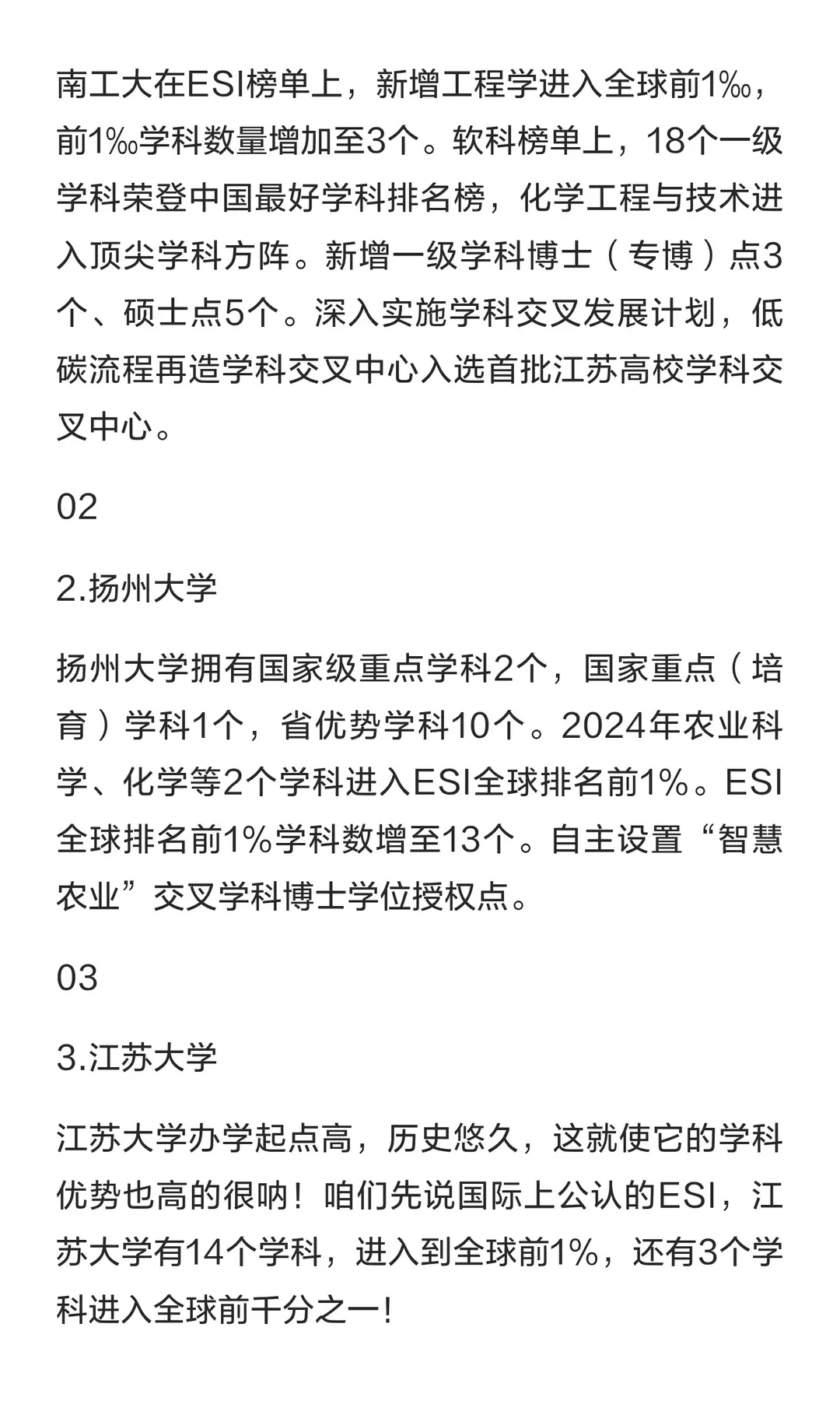 江苏大学的学科实力。被誉为"工科黑马"的江苏大学,在农业工程领域堪称"元老"——我国第一批农机本科、硕士,第一位农机博士和博士后,都从这里走出。在教育部最新轮学科评估中,农业工程拿到了A(前2%-5%),食品科学与工程获评A-(前5%-10%),这样的成绩,让不少"双一流"都望尘莫及。更厉害的是,农业科学、化学、工程科学、材料科学4个学科甚至闯进了ESI全球前1‰。
