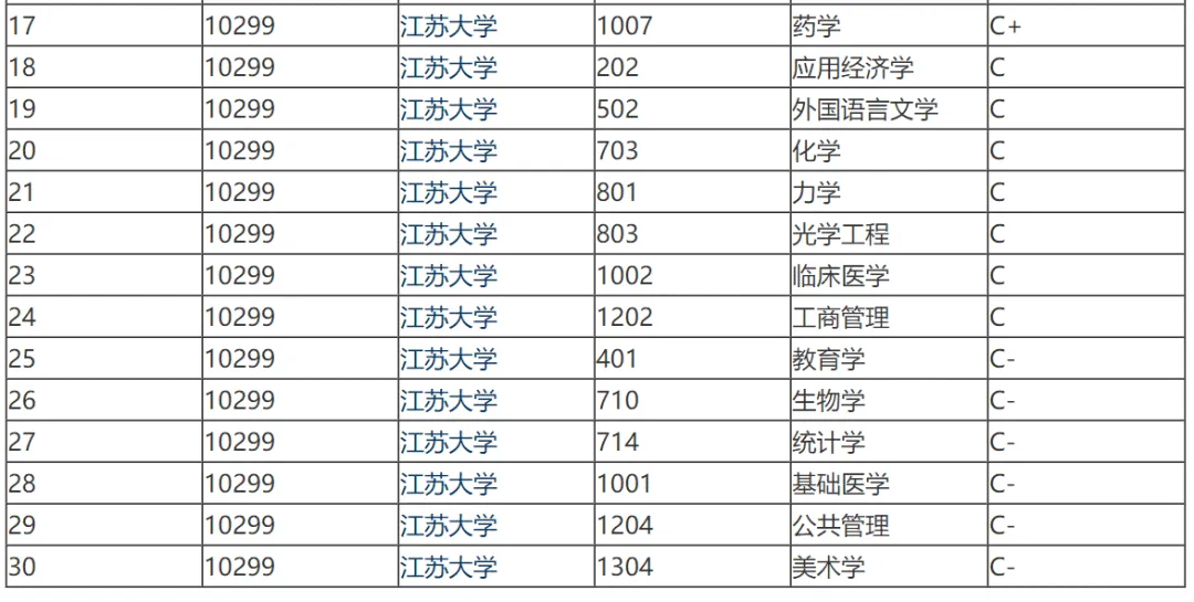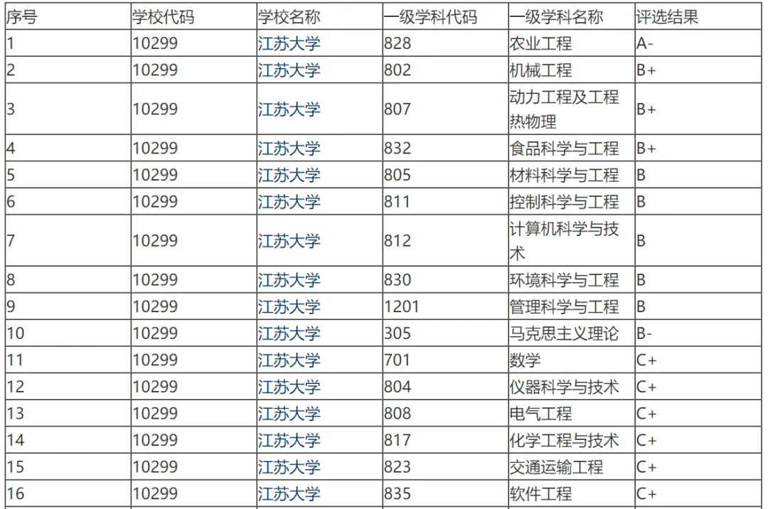 在教育部的第四轮学科评估中,江苏大学一共有参评学科30个,其中有一个A类学科:农业工程为A-;机械工程、动力工程及工程热物理、材料科学与工程等9个学科为B类;数学、仪器科学、软件工程、交通运输工程等20个学科为C类。