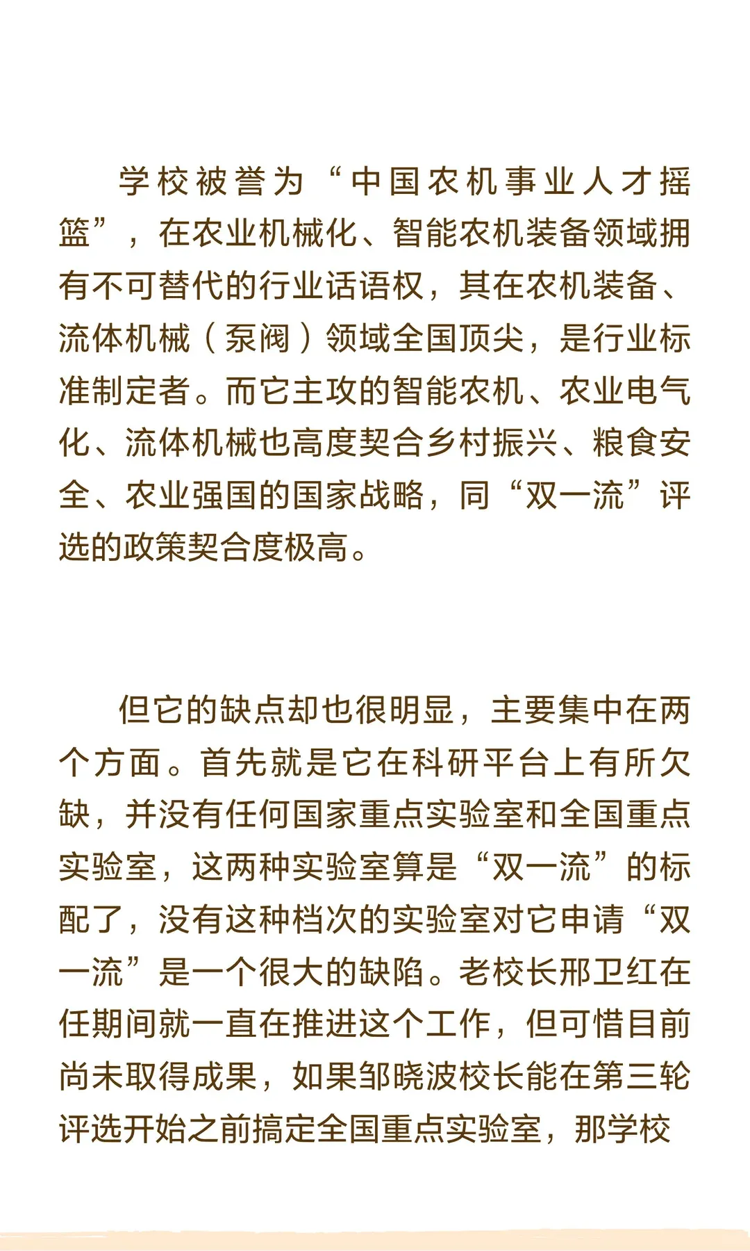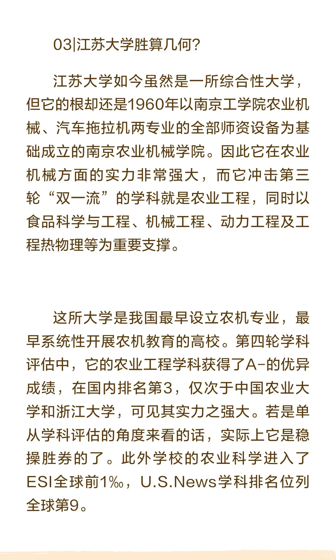 参考教育部第四轮学科评估,农业工程排名第三,这是学校目前排名最靠前的学科,参考上次农业工程一流学科只有2个名额,学校需要进入农业工程前两名,最好再进入ESI千分之一。当然要实现这个目标,任务很艰巨。