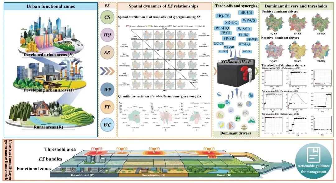 针对快速城市化背景下山地丘陵地区生态系统服务供给能力下降、权衡关系复杂且难以精细治理的问题,研究团队以鲁中南山地丘陵区为典型区域,构建“城市功能分区—生态系统服务簇—阈值区间”三位一体的“社会经济梯度与生态过程”双重分区分析与治理框架,突破了以往单一视角下生态系统服务管理的局限。基于人口、经济与建设强度,将区域划分为中心城区、城市建设区和乡村区,综合评估生境质量、碳固存、水源涵养、水质净化、土壤保持和粮食供给六类服务,从总体上刻画了不同城市功能分区下生态系统服务供给水平的空间分布特征及其随城市化变化的差异表现。研究发现,不同功能区生态系统服务关系明显分异:中心城区以调节类服务协同为主,城市建设区协同与权衡并存,乡村区以供给与调节服务权衡最为突出;其中,水源涵养与碳储存是对城镇化最敏感的权衡对。结合地理加权回归与XGBoost-SHAP模型,系统识别了主导驱动因子及其非线性阈值效应,揭示森林覆盖、气候条件与人类活动强度共同塑造服务关系演变,并存在森林覆盖率约10%、年均气温14.0–14.7 ℃、年降水量约900 mm等关键阈值。进一步将五类生态系统服务簇与城市功能区及阈值区间进行空间耦合,提出分区、分类型调控路径,为城镇化背景下山地丘陵地区生态系统服务协同提升与精细化、差异化治理提供了可推广的方法框架与操作路径。