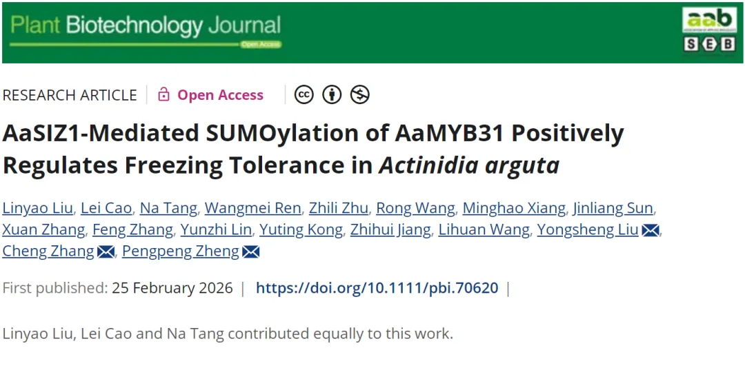 2026年2月25日,《Plant Biotechnology Journal》期刊在线刊发安徽农业大学园艺学院刘永胜/郑朋朋团队题为“AaSIZ1-Mediated SUMOylation of AaMYB31 Positively Regulates Freezing Tolerance in Actinidia arguta”的最新研究成果。